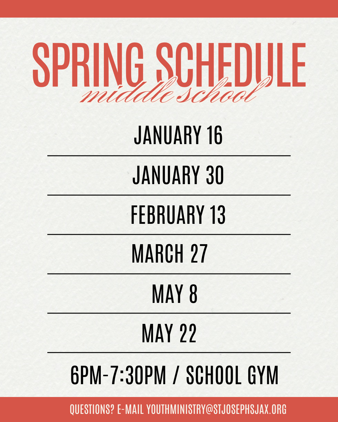 Middle School Youth Ministry meets about once per month on Friday from 6:00 p.m. until 7:30 p.m. at the school gym.